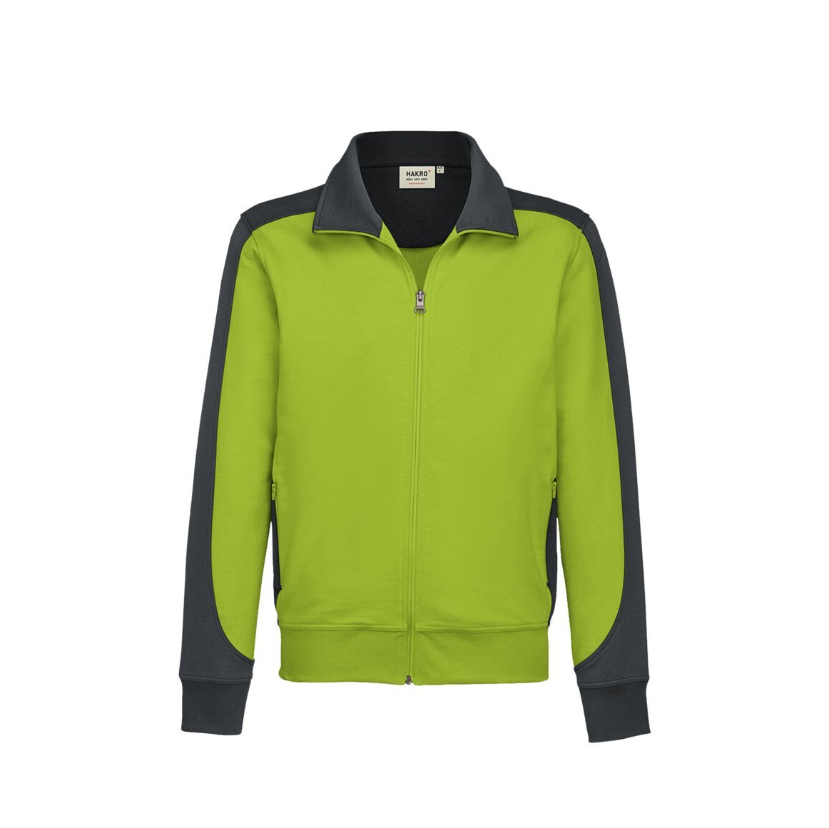 Besonders strapazierfähige Sweatjacke mit Einsätzen in Kontrastfarbe Anthrazit an den Seiten, Ärmeln, Schultern und am Kragen, sowie kontrastfarbigen, gerippten Ärmelbündchen. Leasingkoller zur einfachen Kennzeichnung in der gewerblichen Wäscherei und Aufhängebänder im Saum. Hochwertiger Frontreißverschluss und seitliche Einschubtaschen mit verdeckten Reißverschlüssen. Alle Reißverschlüsse von YKK® Ton in Ton. Mittelschweres Sweatmaterial aus MIKRALINAR®, dem HAKRO Performance-Materialmix aus Baumwolle und Polyester. Innenseite nicht angeraut (French Terry). Formstabile, LYCRA®-verstärkte Bündchen. Lockere Passform: Comfort Fit.