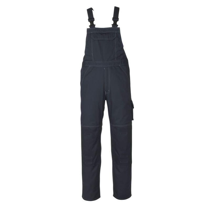 Leichte Meterware. Dreifache Kappnähte an den Beinen und im Schritt. Schulterträger aus Stoff, verstellbar und mit kurzem, kräftigem Gummizug sowie Kunststoffschnallen. Latztasche mit Patte und verdeckten Druckknöpfen. D-Ring. Innentasche mit Klettverschluss. Bund ist regulierbar. Vordertaschen. Hosenschlitz mit Reißverschluss. Gesäßtaschen, verstärkt, mit Patte und verdeckten Druckknöpfen. Schenkeltasche mit Patte und verdeckten Druckknöpfen. Zollstocktasche, verstärkt. Knietaschen, höhenregulierbar. Kontrastnähte. Zertifiziert zusammen mit Kniepolstertyp large gemäß EN 14404-3. OEKO-TEX® STANDARD 100. ProWash® - EN ISO 15797