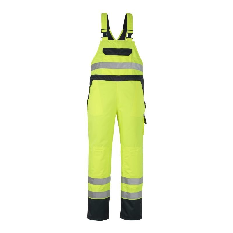 Fluoreszierend mit Reflexen. Zweifarbig. Atmungsaktiv, wind- und wasserdicht. Nähte sind verklebt. Futter aus leichter Qualität. Schulterträger aus Stoff, verstellbar und mit kurzem, kräftigem Gummizug sowie Kunststoffschnallen. Latztasche mit Patte und Stifttaschen. Gummizug im Rücken. Vordertaschen mit Patte und Druckknopfverschluss. Gesäßtaschen mit Verstärkungen und Patte mit Klettverschluss. Hammerschlaufe, verstellbar. Schenkeltasche mit Patte und Klettverschluss. Zollstocktasche. Knietaschen, höhenregulierbar. Druckknopfregulierung an den Fußgelenken. Zertifiziert zusammen mit Kniepolstertyp large gemäß EN 14404-3. OEKO-TEX® STANDARD 100. EN 343 3/1. EN ISO 20471 - Klasse 2. Hi-Vis Gruppe Y Das Produkt ist zertifiziert, dass dieses mit einem Logo von 0,6200m² versehen werden darf. Dieses zulässige Areal darf nicht überschritten werden. Das Logo auf der Vorder- und Rückseite darf jeweils maximal 50% des gesamten Logoareals betragen, um die Zertifizierung gemäß EN ISO 20471 beizubehalten. Hinweis: Der aufgeführte Bereich ist lediglich ein Leitfaden dazu, wie viel Platz für die Logoplatzierung zur Verfügung steht. Um die Hi-Vis-Klasse des Produkts gemäß EN ISO 20471 beizubehalten, müssen die Anweisungen zur Logogröße eingehalten werden.