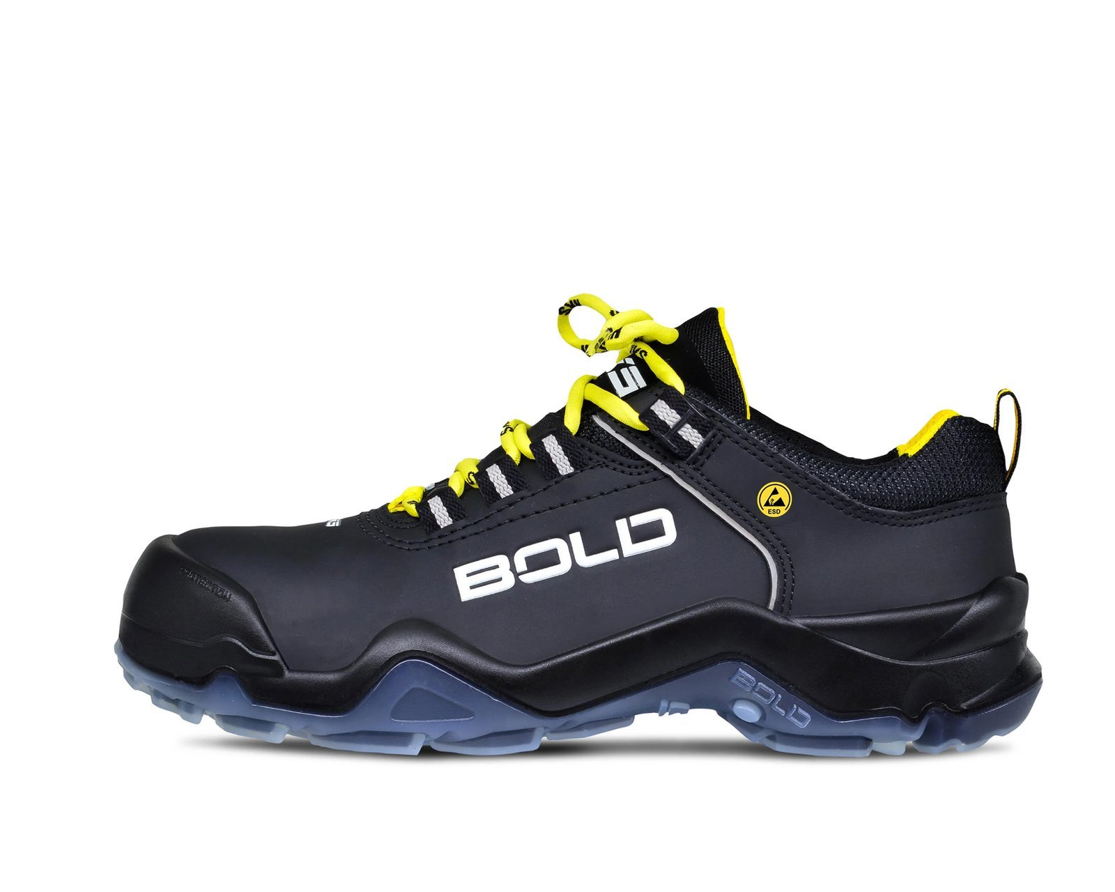 Approved Vegan, wasserabweisende Mikro-Tech Faser. Polyurethan Überkappe. Metallfrei. Atmungsaktive Distance-Net-Schuhfütterung. Nageldurchtrittschützende T-Laminate. Seitenaufprallschutz. Energy Return Sohlendämpfungssystem. ESD-Ausstattung. Zertifiziert gemäß DGUV 112 - 191. Kappe: Composite Kunststoff Durchtrittschutz: T-Laminate Einlage: Multikomfort-Fußbett Laufsohle: Bold TPU/PU